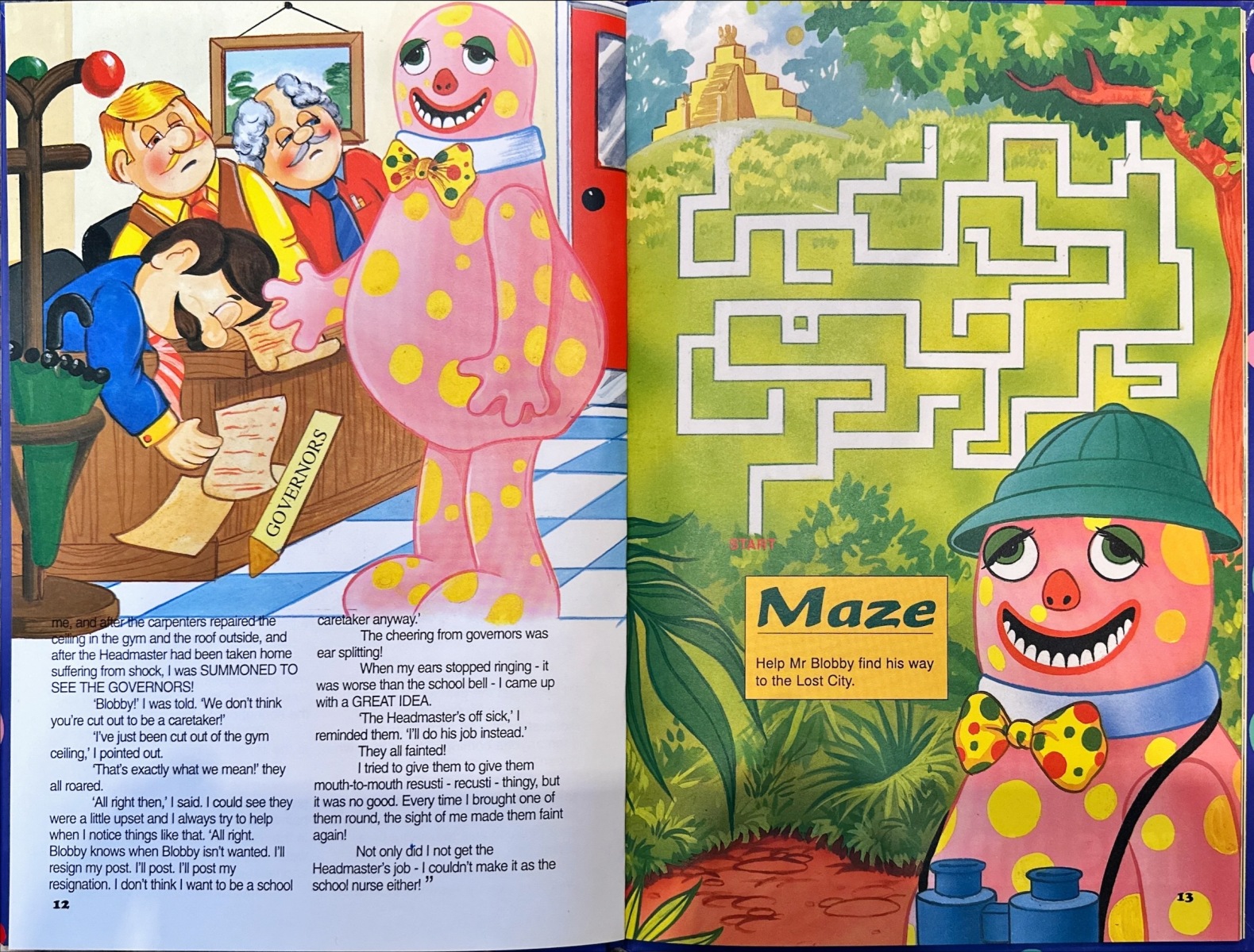 1. Thanks for this. I lovely Mr Blobby as a kid for his anarchic antics and I still do to be honest. He’s an agent of chaos. The illustrations of him on pages 12 and 13 make him look stoned as fuck but also gurning like he’s dropped a disco biscuit. Up, down, sideways and all around – that’s Blobby.