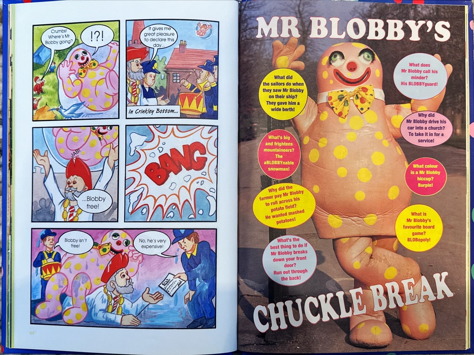 1. Thanks for this. I lovely Mr Blobby as a kid for his anarchic antics and I still do to be honest. He’s an agent of chaos. The illustrations of him on pages 12 and 13 make him look stoned as fuck but also gurning like he’s dropped a disco biscuit. Up, down, sideways and all around – that’s Blobby.