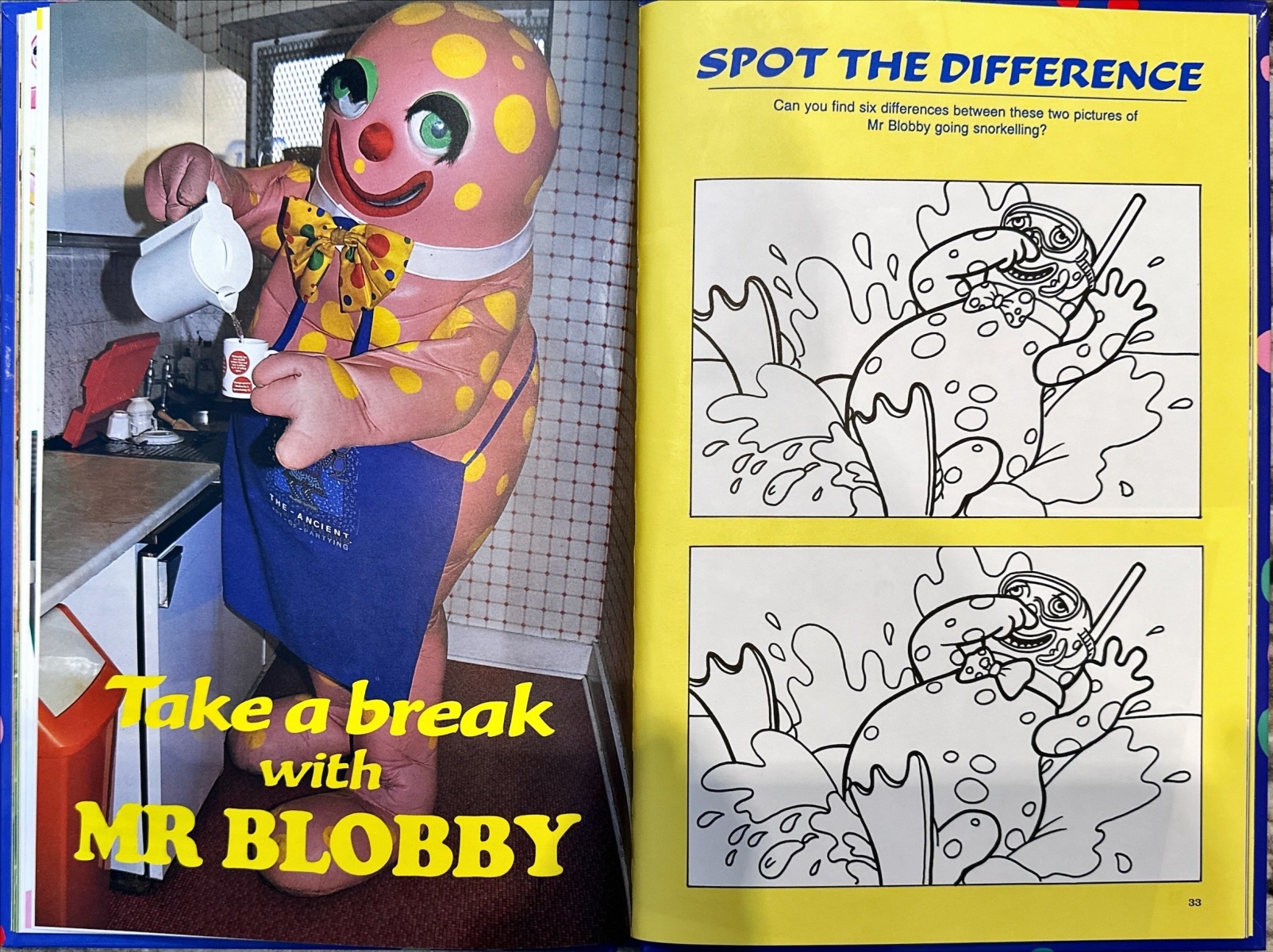1. Thanks for this. I lovely Mr Blobby as a kid for his anarchic antics and I still do to be honest. He’s an agent of chaos. The illustrations of him on pages 12 and 13 make him look stoned as fuck but also gurning like he’s dropped a disco biscuit. Up, down, sideways and all around – that’s Blobby.